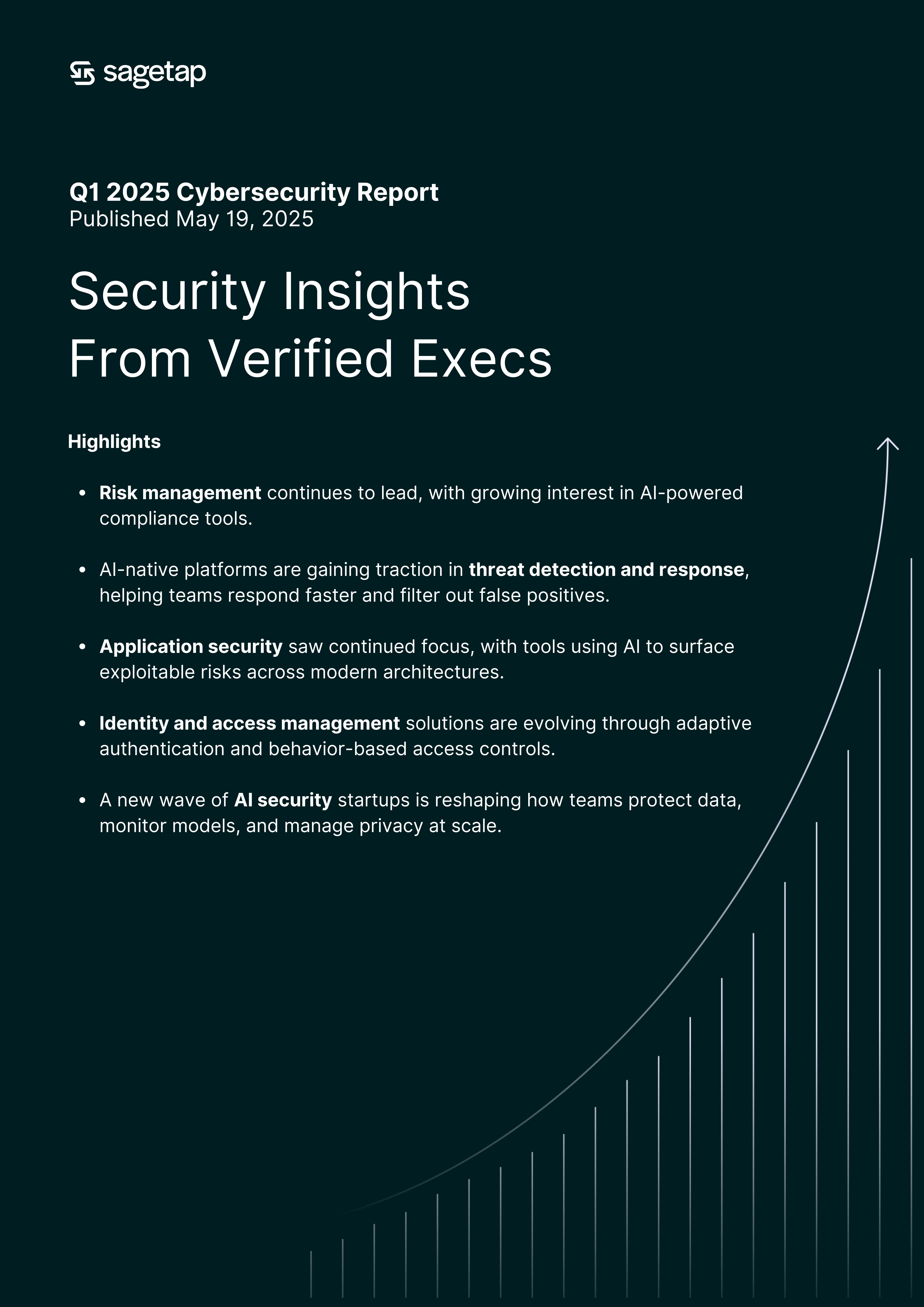 Sagetap's Q1 2025 Cybersecurity Report sheds light on where top enterprise CISOs are investing time, attention, and budget this year. It's based on verified behavior across the Sage platform, including the actual initiatives security executives created, vendors they evaluated, and meetings they booked.